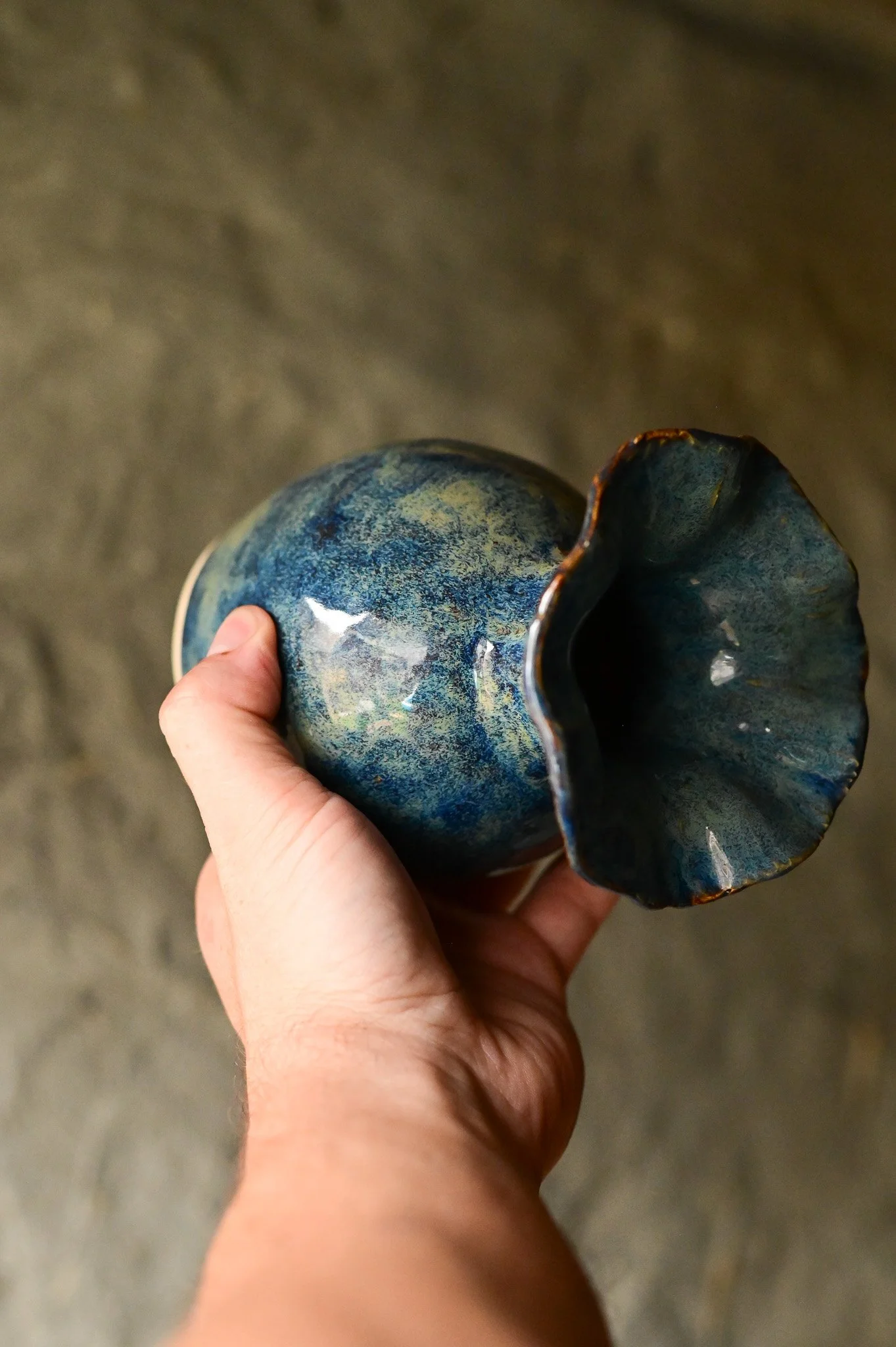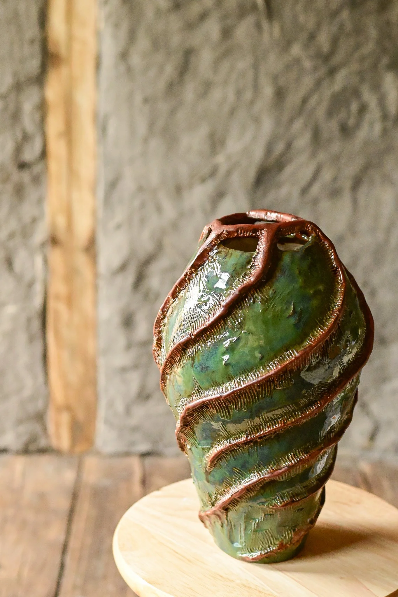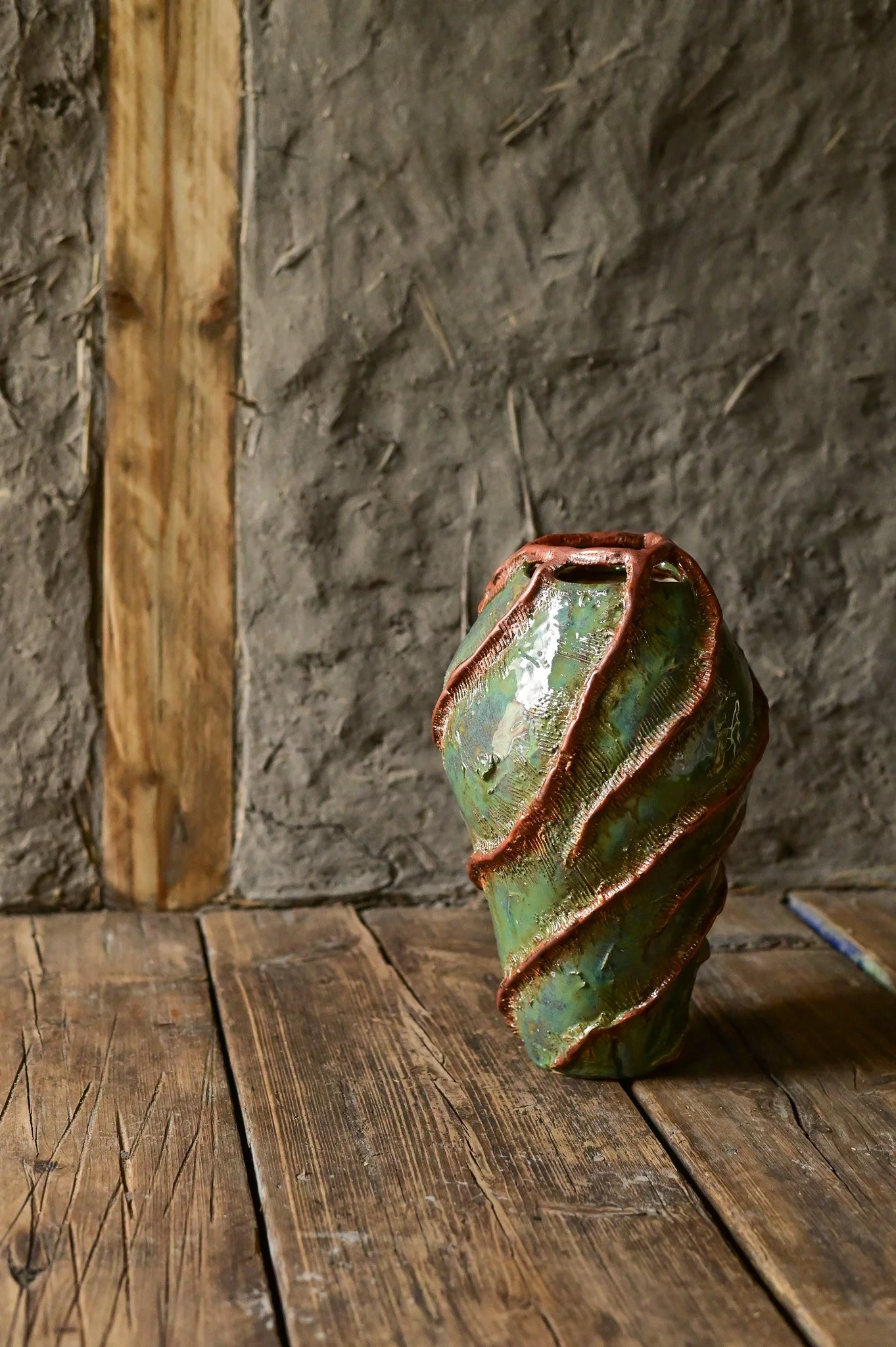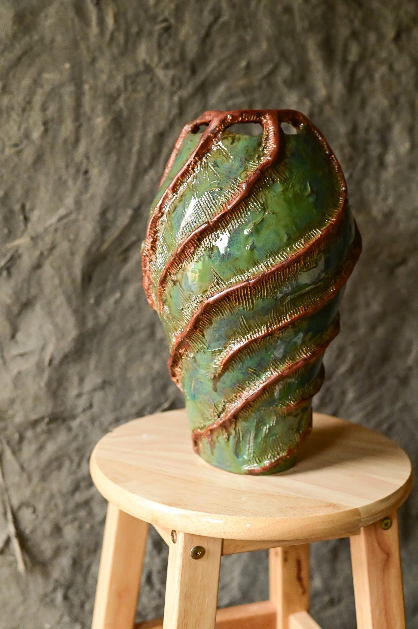 Textured Green Bowl £45.00 Hand-Carved Stoneware Mugs (Soon available) £45.00 Sold out Iridescent Purple Vase £220.00 Sold out Wide Blue and Copper Serving bowl £85.00 Bulbous Carved Vase with Copper Rim and Interior £195.00 Tall Copper & Cream lamp base with Ruffled Rim (soon available with light fittings and lamp shade) £195.00 Sold out Blue Ruffled-Edge Vase £95.00 Sold out Green Spiral Vase £195.00 Tall Flared Vase with Crawling Glaze £135.00
