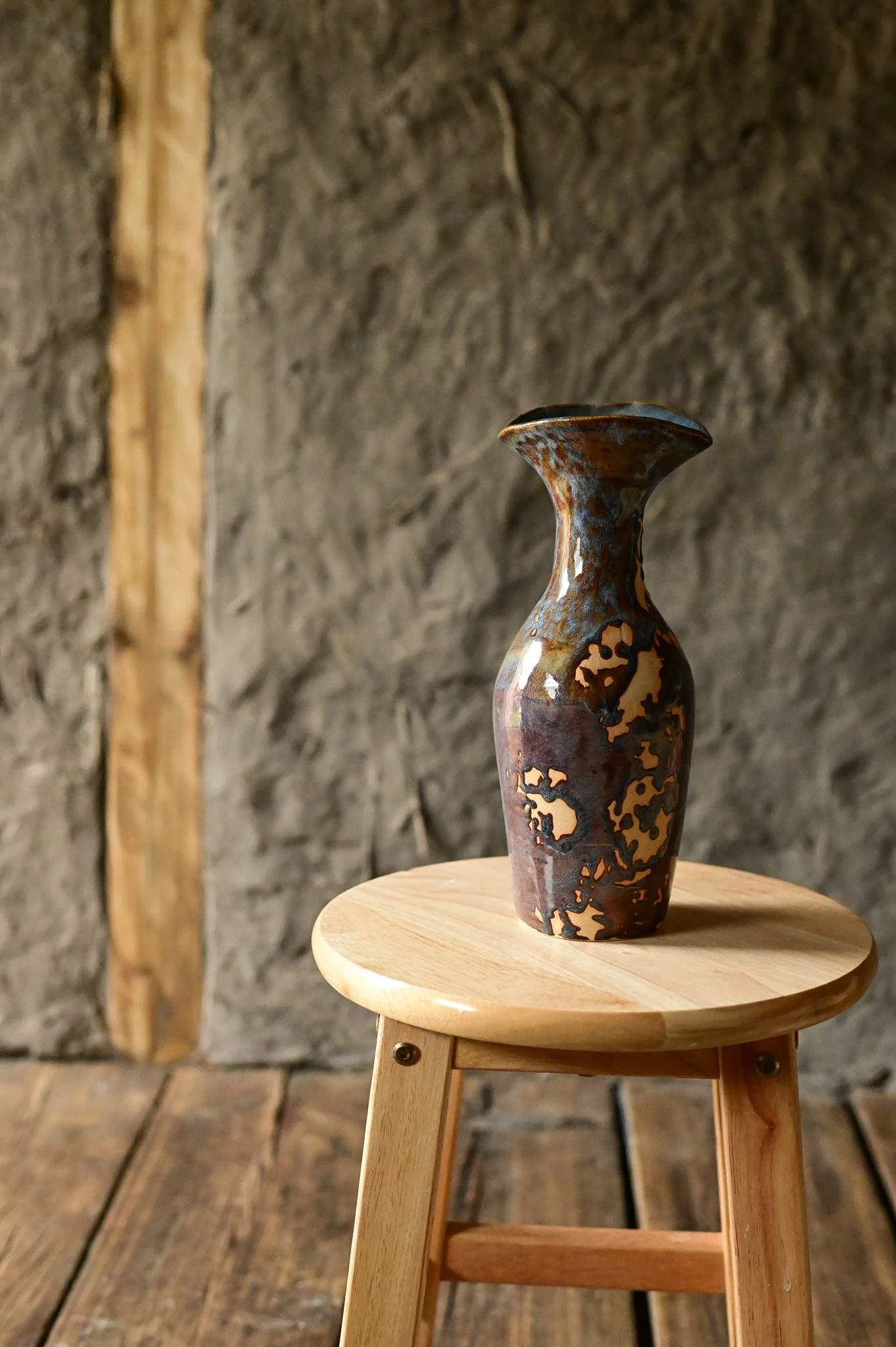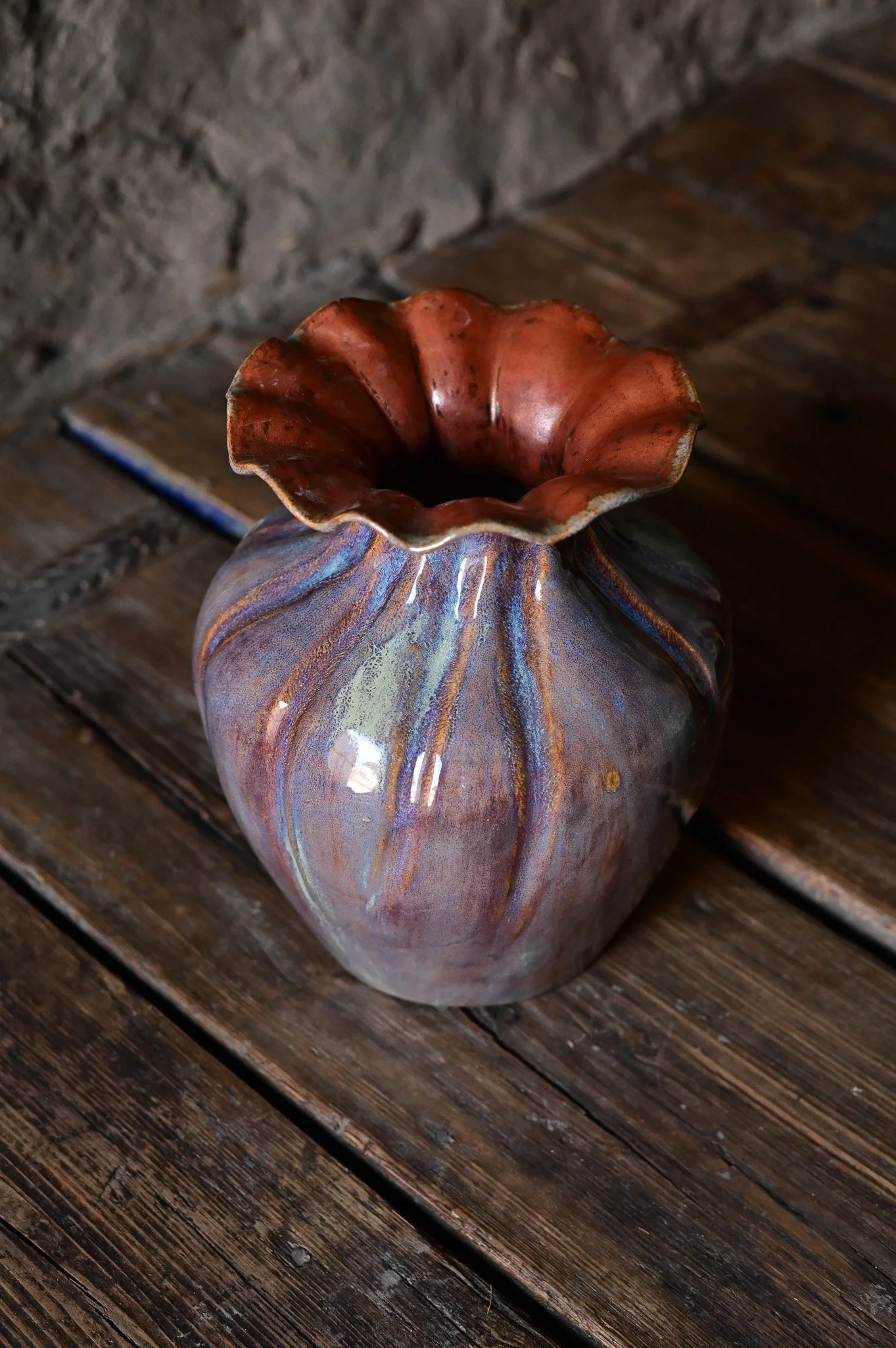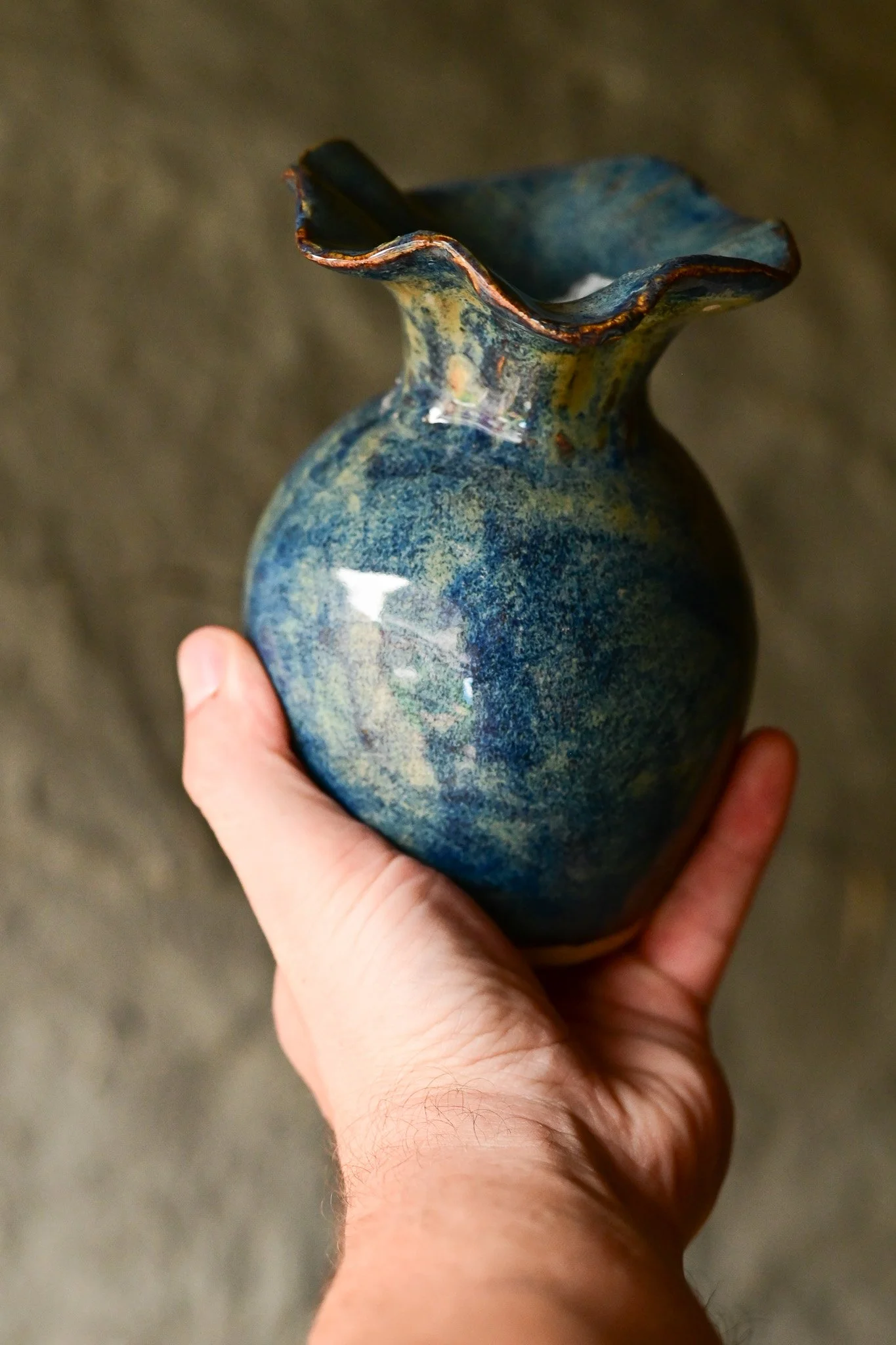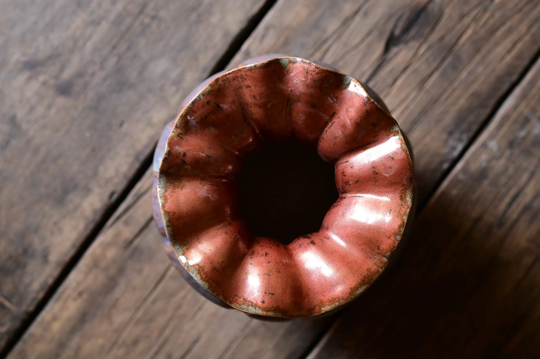 Textured Green Bowl £45.00 Hand-Carved Stoneware Mugs (Soon available) £45.00 Sold out Iridescent Purple Vase £220.00 Sold out Wide Blue and Copper Serving bowl £85.00 Bulbous Carved Vase with Copper Rim and Interior £195.00 Tall Copper & Cream lamp base with Ruffled Rim (soon available with light fittings and lamp shade) £195.00 Sold out Blue Ruffled-Edge Vase £95.00 Sold out Green Spiral Vase £195.00 Tall Flared Vase with Crawling Glaze £135.00